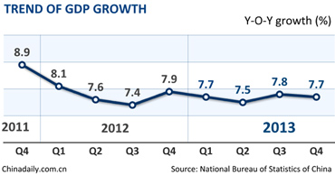 China's economic growth scored 7.7% in 2013, just above the target of 7.5% set at the beginning of the year.