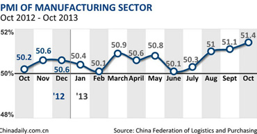 Purchasing managers' index for the manufacturing sector rose to 51.4 percent in October from a month earlier, hitting a new high since May 2012.