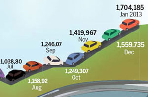 China's passenger vehicle sales in January surged more than 45 percent from a year earlier, the largest year-on-year growth since April 2010.