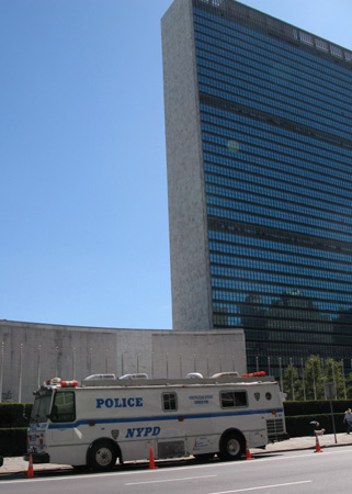 Several police vans parked on the streets near the UN buildings, and policemen with patrol dogs could be seen in nearby blocks. The New York City police authorities announced traffic control in the vicinity of the summit venue, which began at 2 am on Sunday (US time), but traffic flow on the First Avenue, by which the UN headquarters stands, did not seem thinner than the day before. Tour buses stopped by one after another. Outside the UN compound, a tour guide surnamed Liang was trying to comfort several complaining tourists, who found the UN tour had been canceled because of the upcoming events. "What you can see inside will be only conference halls, none of them as big as the Great Hall of the People in Beijing, which can hosts more than 10,000 people at a time," said Liang from Ritz Tour. A woman from Sichuan said she did not know the UN building would be closed to tourists beginning Sunday. "Otherwise I would have come yesterday". A UN security guard said the venue will be closed for tourists for the whole week during the session.