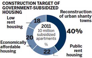 The country will spend about 1.3 trillion yuan ($197 billion) to build 10 million units of government-subsidized housing this year, a senior official said on Wednesday, amid government efforts to curb surging property prices and deliver the benefits of economic growth to more people.
