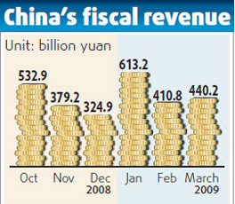 The government's revenue fell 8.3 percent from a year earlier in the first quarter, as the economic downturn hurt corporate profits and recent tax cuts took effect.