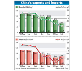 Exports dropped 25.7 percent year-on-year to $64.9 billion in February, the largest fall in more than a decade and the fourth monthly decline in a row. Imports fell 24.1 percent to $60.05 billion.