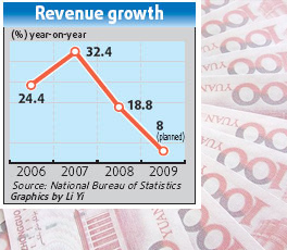 The government's revenue fell 11.4 percent from a year earlier in the first two months, as the economic downturn hurt corporate profits and recent tax cuts took effect.