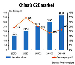 Transaction volume of China's customer-to-customer (C2C) shopping market hit 31.17 billion yuan ($4.55 billion) in the fourth quarter of 2008, up 144 percent year-on-year, and 22 percent from the third quarter.