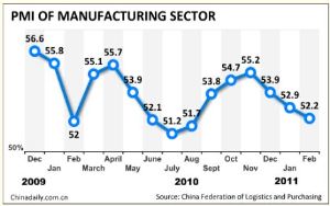 The Purchasing Managers Index (PMI) of China's manufacturing sector weakened to 52.2 percent in February, a six-month low, the China Federation of Logistics and Purchasing (CFLP) said Tuesday.