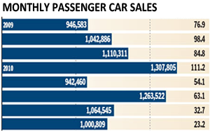 China's monthly passenger vehicle sales continued to decline in May, bringing the risk of a glut to vehicle producers after they aggressively expanded production capacity in response to last year's unexpected market boom.