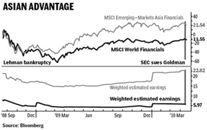 Bank shares in countries such as China and India may extend their advantage amid fraud probes of Goldman Sachs Group Inc.