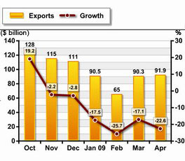 China's export dropped 22.6 percent in April year on year to $91.94 billion, falling for the sixth month in a row, the General Administration of Customs said.