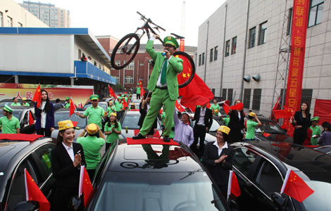 Chinese businessman and philanthropist Chen Guangbiao speaks during a ceremony offering 43 new cars to people whose Japanese-brand cars were damaged during anti-Japan protests, in Nanjing, Oct 10, 2012.