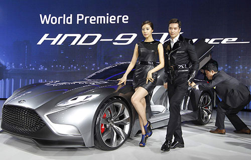 Models pose next to Hyundai Motor's luxury sports coupe concept "HND-9" at the Seoul auto show in Goyang, north of Seoul March 28.