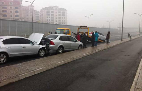 More than 100 cars were involved in accidents on the viaduct between Taiyanggong and Wangjing in Beijing due to snowy weather on the morning of Jan 31. The road was completely congested.
