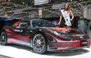 Models are pictured next to a Skoda Vision C concept car at the 84th International Geneva Motor Show, in Geneva, Switzerland on March 4, 2014.