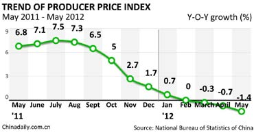 China's Producer Price Index (PPI), a main gauge of inflation at the wholesale level, fell 1.4 percent in May from a year earlier.