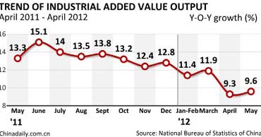 China's industrial value-added output grew 9.6 percent year on year in May after adjusted by inflation, the National Bureau of Statistics said.
