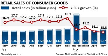 China's retail sales grew 13.8 percent year on year to 1.67 trillion yuan ($265.08 billion) in May, the National Bureau of Statistics (NBS) said.