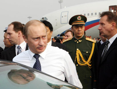Russian President Vladimir Putin is to get on a car after arriving at Beijing International Airport March 21, 2006. Russia and China aim to more than double bilateral trade by 2010, officials from both countries said, during a trip to China by President Vladimir Putin that will focus on deepening energy cooperation. Putin is visiting China March 21-22. [Xinhua]
