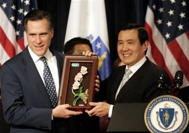 Ma Ying-jeou back to alma mater (AP) Updated: 2006-03-22 14:49  Massachusetts Gov. Mitt Romney, left, shows the gift from Taiwan's