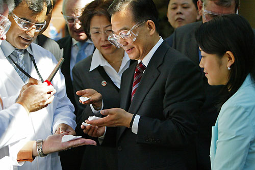 Chinese Premier Wen Jiabao (2nd-R) handles a formation of stable natural gas hydrate during an experiment at the Woodside Hydrocarbon Research Facility at Curtin University of Technology in Perth, Australia April 2, 2006. [Reuters]