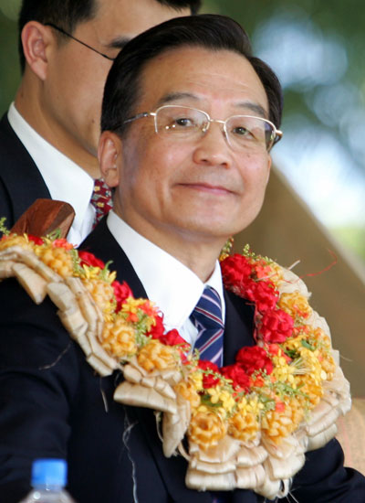 Chinese Premier Wen Jiabao smiles whilst wearing a traditional garland around his neck during a welcoming ceremony in Nadi, Fiji April 5, 2006. [Reuters]p