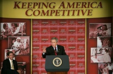 President Bush delivers remarks on the American Competitiveness Initiative, Wednesday April 19, 2006, at Tuskegee University in Tuskegee, Ala., as Alabama Gov. Bob Riley listens at left. [AP]