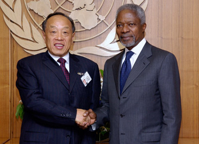 Chinese Foreign Minister Li Zhaoxing (L) meets UN