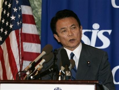 Japanese Foreign Minister Taro Aso pauses during remarks at a Center for Strategic and International Studies forum on Wednesday, May 3, 2006 in Washington. [AP]