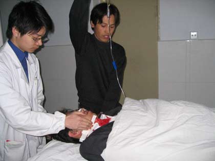 The hostage receives treatment at a hospital after being injured by a kidnapper in Xiangfan, central China's Hubei Province, May 12, 2006. The kidnapper was overwhelmed 40 minutes after a standoff with the police.  [Newsphoto]
