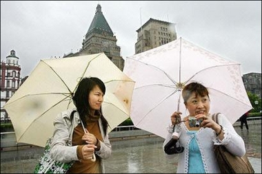 rain to take photos on Shanghai's historic Bund area. Typhoon Chanchu