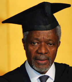 Kofi Annan delivers a commemorative speech to students during an honorary