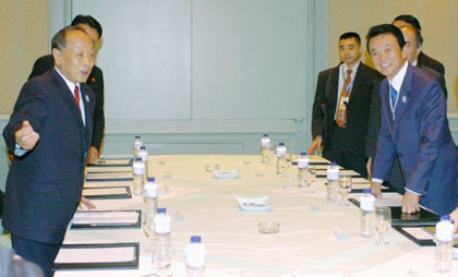 Minister Li Zhaoxing (L) and his Japanese counterpart Taro Aso meet