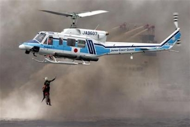 members hoist an imaginary castaway to a JCG helicopter as a JCG
