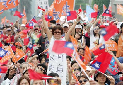 wave opposition party flags as they call for "president" Chen Shui-bian to
