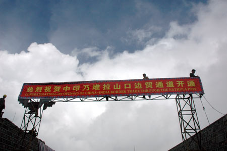arrange the banner at the Nathu La Pass, July 4, 2006. China and India are