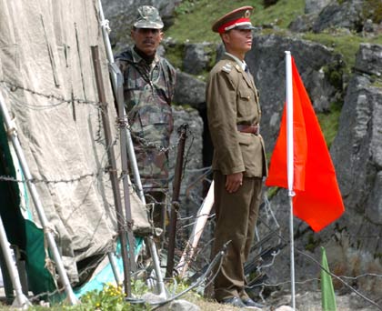 People's Liberation Army and an Indian soldier (L) stand guard at the Nathu La