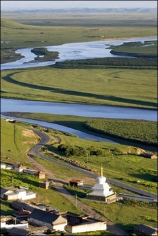 The Yellow River flows past a Tibetan village