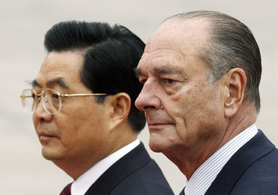Chirac (R) and Chinese President Hu Jintao review the honour guard during a