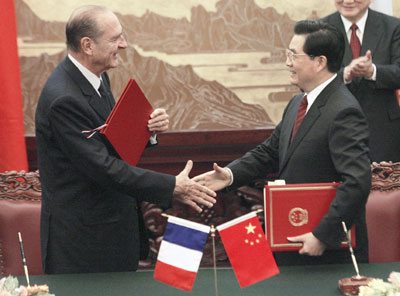 France's President Jacques Chirac shakes hands with China's President Hu Jintao (R) during a signing ceremony at the Great Hall of the People in Beijing October 26, 2006. [Reuters] [More photos on Chirac visit]