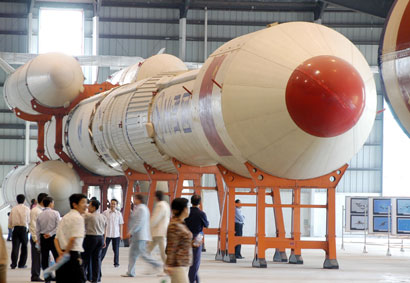 Visitors watch a Long March carrier rocket on display at the Airshow China 2006 in Zhuhai, a coastal city in southern China's Guangdong Province on October 31, 2006. [newsphoto]