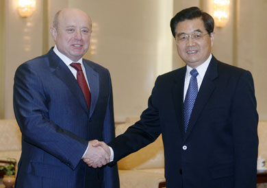Chinese President Hu Jintao (R) receives visiting Russian Prime