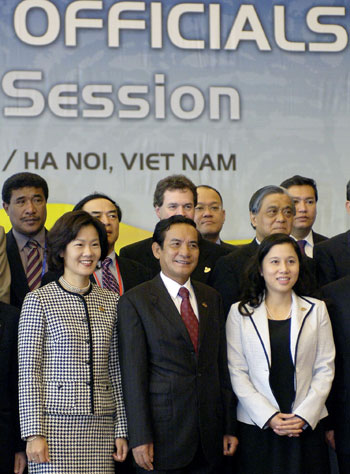 Delegates poses for a photo at the Senior Officials Meeting of the Apec in Hanoi. [Xinhua]
