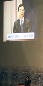 peace. From 1978 to 2005, China's GDP increased from US$147.3 billion to US$2.235 trillion, registering an average annual growth of 9.6 per cent. In the same period, China's trade increased from US$20.6 billion to US$1.4221 trillion, growing by 16 per cent annually. "We will further deepen the reform of foreign-related economic sectors, accelerate the transformation of pattern of trade growth and improve trade structure to ensure balanced growth of import and export," he said, "we will actively introduce foreign investment, open the service sectors wider, enhance intellectual property rights protection and raise China's overall level of openness." Since China's accession to the World Trade Organization in 2001, China's import has totaled US$2.4 trillion, and foreign investors in China repatriated US$58 billion in profit. Statistics of the World Bank show that in this period, China on the average contributed to 13 per cent of the world economic growth, according to Hu. China calls for building a harmonious world of enduring peace and common prosperity and Hu said that harmony is a "defining value of the Chinese civilization." He encouraged business leaders to give more priority to exploring business opportunities and expanding market share in developing countries. But he also said that China faces major problems and challenges, including persistent structural imbalance and inefficient mode of economic growth. "To resolve these pressing issues, we pursue a scientific outlook on development which puts people first and aims at comprehensive, coordinated and sustainable development," said Hu, who put forward four-point measures. -- Speed up economic restructuring and transformation of pattern of economic growth. --Accelerate the building of new socialist rural village to break down the barriers between urban and rural areas. -- Promote balanced regional development. More support will be given to less developed and poorer regions. -- Build a harmonious society. "The key message from Hu's speech is the development in peace," said Kelvin Lee, managing director of the Vina Capital company, noting the peaceful rise of China will bring benefits to the region and the world. "Hu told business leaders from Asia-Pacific that we are in the one big family and we must work together," Lee told China Daily after the speech. He appreciated Hu's proposal of increasing official aid to developing countries. "After making yeas of efforts to prosper its economy, China starts to play bigger role in providing help to other countries, which is the significant step for narrowing the development gap," he noted. Christopher J. Flint, senior sales director of the Boeing company, said that China is a good example for developing countries in terms of elimination of poverty and improving people's lives. China's growing role in international affairs will be conducive to world peace and prosperity, he added. China successfully hosted the summit with 47 African countries earlier this month and it introduced a package of aids to African countries, including doubling the assistance amount to them.