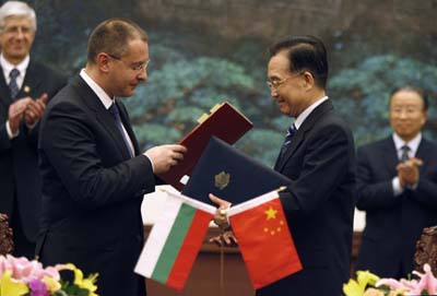 Chinese Premier Wen Jiabao (2nd R) exchanges documents with Bulgarian Prime