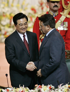 (R) shakes hands with Chinese counterpart Hu Jintao in Islamabad November