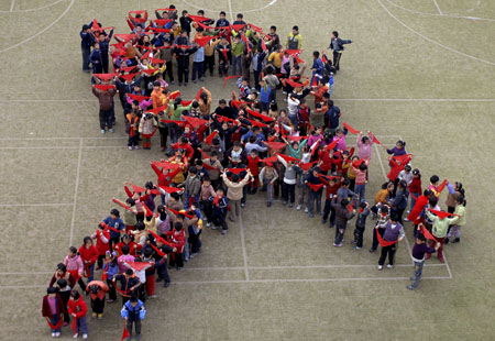 up to form an anti-Aids symbol during an HIV/AIDS awareness rally at a primary