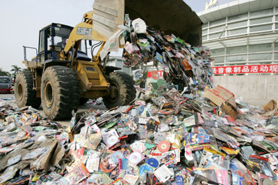 crushes confiscated pirated audio&video discs during a crackdown on piracy