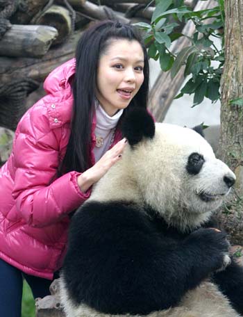 Taiwan singer-actress Vivian Hsu poses with panda "Kaikai" at the Chengdu Research Base of Giant Panda Breeding in southwest China's Sichuan Province December 10. Vivian took a close encounter with fans and giant pandas at the breeding centre. [newsphoto]
