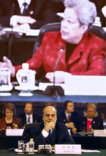 U.S. Federal Reserve Chairman Ben Bernanke (C) listens as Chinese Vice Premier Wu Yi, appearing on a screen behind him, makes remarks at the Great Hall of the People in Beijing December 14, 2006, during their Strategic Economic Dialogue. [Reuters]