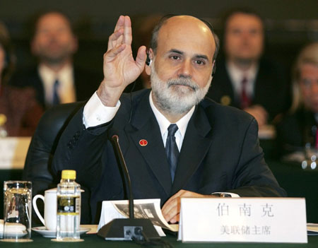 U.S. Federal Reserve Chairman Ben Bernanke waves towards members of the Chinese delegation as he is introduced at the opening of the Strategic Economic Dialogue in the Great Hall of the People in Beijing December 14, 2006. [Reuters]