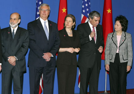 U.S. Federal Reserve Chairman Ben Bernanke, EPA Administrator Stephen Johnson, Trade Representative Susan Schwab, Commerce Secretary Carolos Gutierrez and Labour Secretary Elaine Chao (L-R) wait for the start of the Strategic Economic Dialogue with their Chinese counterparts at the Great Hall of the People in Beijing, December 14, 2006. [Reuters]
